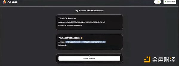 4 )接著你可以看到你的 EOA 錢包和賬戶抽象錢包,賬戶抽象錢包是合約錢包,因此它的地址是確定的且在連接 MetaMask 后自動生成的