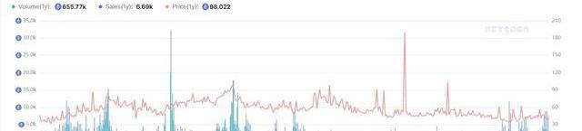 1)從一年的時間跨度來看,在這年里總交易額達到655.77kETH,交易量6.69k,平均價在98ETH左右。交易量和交易次數都出現了三次高峰。在每次高峰中,至少有92筆交易,總交易金額至少為1,3178ETH。