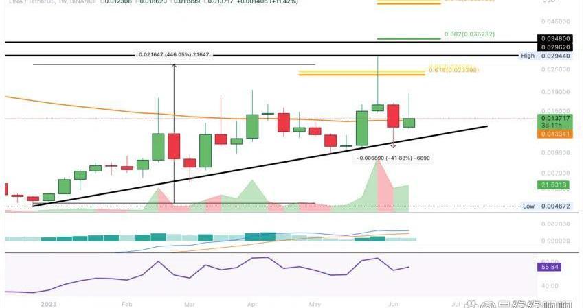 LINA正在接近下一個重要的斐波那契阻力位0.024美元左右,如果價格突破50周均線約0.0133美元,它可能達到該水平。