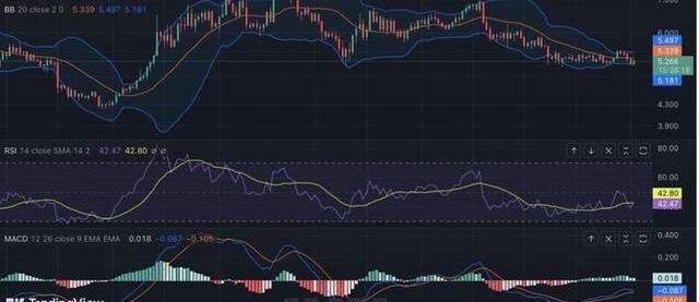 移動平均收斂發散(MACD)指標表明,隨著MACD線越過信號線,看漲勢頭正在增強。相對強弱指數目前為42.79,表明市場處于中性區域。布林帶表明市場波動較大,價格可能會繼續走高。布林帶上軌目前為5.511美元,可作為阻力,而布林帶下軌為5.13美元,可作為支撐。