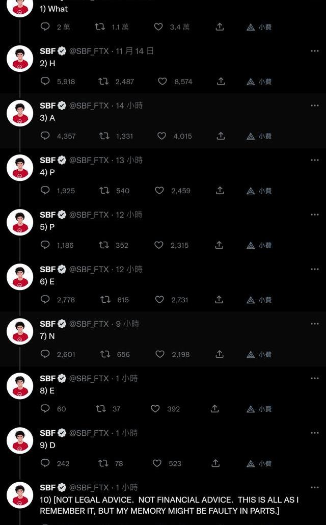 目前來看,SBF的一系列神秘推文,連接起來已變成「Whathappened」,SBF稍早還發推補充稱「這不是法律建議,不是財務建議,這都是我記得的,但我的記憶可能有部分錯誤」。