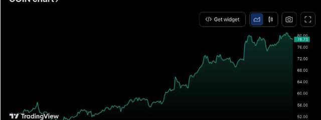 根據TradingView的數據,Coinbase股價飆升51%,從6月6日的約52美元上漲至7月7日的78.7美元。該股在過去六個月內也上漲了約133%,而同比增長約為50%。