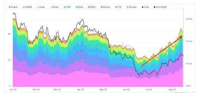 這是ETH期貨未平倉合約的圖表。未平倉合約是市場參與者在給定時間點持有的未平倉期貨合約的總數。正如你所看到的,它正在從6月中旬加密貨幣信貸崩潰期間的低點回升。未平倉量增加的同時曲線處于現貨溢價狀態。在我看來,這意味著拋售壓力在不斷加大。相反,如果曲線處于期貨溢價,未平倉合約數量增加,這將表明邊際上存在巨大且不斷上升的買入壓力。