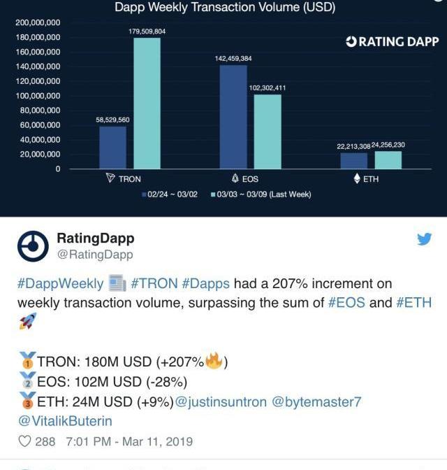 據DeltaDapp公司稱,該公司的每周交易量已經爆炸,該公司提供準確的dapp數據,用戶見解和市場分析,為1,890個目標提供準確的dapp分析平臺。根據RatingDapp數據,Trondapps從3月3日至9日的每周交易量增長了207%。根據這些數據,Tron的每周交易量1.8億美元遠遠超過EOS和以太坊-。