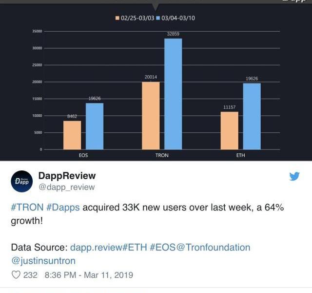 此外,據dapp分析平臺DappReview提供市場分析,用戶見解以及針對6家公共連鎖店和超過2,000家公司的準確dapp數據,Trondapps上周收購了33,000名新用戶,預示著64%的增長。DappReview強調了Trondapps的每周新用戶以及以太坊和EOSdapps的新用戶。如下面的推文所示,在過去兩周內,Tron在新的dapp用戶方面遠遠超過以太坊和EOS。