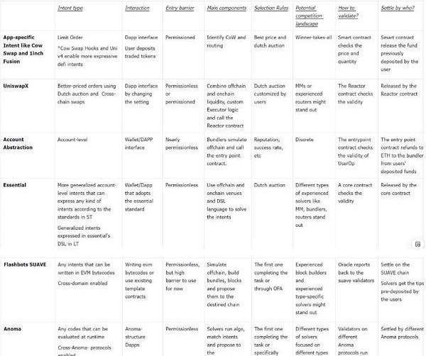 為了理解intent是如何運作的,我們可以分析一下目前可用的解決方案,從特定intent應用程序到像Anoma和SUAVE這樣的通用intent基礎設施。該分析將主要分為5個部分,側重不同的問題: