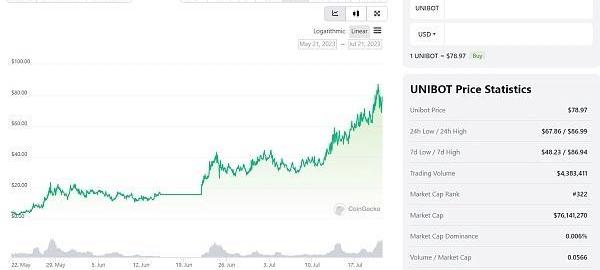 數據層面,Unibot(UNIBOT)從5月22日以2.46美元發行,至今漲幅已達到3029.96%,目前幣價為78.93美元。從投資回報率上來看,可謂十分可觀。