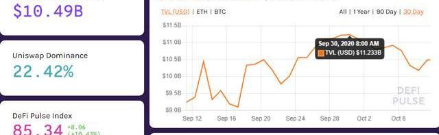 今天以太坊上面DEFI的鎖倉中金額是104.9億美金,確實比9月底有一些下降。不過我們可以算一下比例,鎖倉金額最高發生在9月30日,為112.33億,下降比例僅為6.6%。
