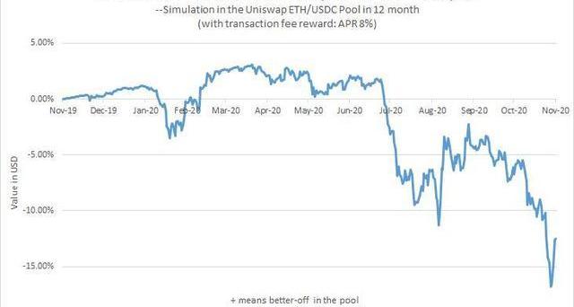 對于任何流動性提供者來說,當存入資產的價格發生變化時,其損失率往往是不可忽視的。下圖是2019年11月27日在Uniswap上存入ETH/USDC池并停留一年的情況。