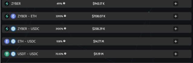 到1月下旬,包括Zyberswap在內的DeFi項目出現在Arbitrum生態系統中。2月8日,Zyberswap的代幣ZYB登陸多家CEX,短短24小時內價格暴漲100%。此外,該項目還提供了誘人的回報,提醒投資者加密牛市的開始。