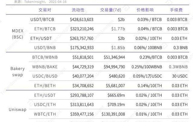 三種DEX的主要交易對流動性和交易數據對比,來源:tokeninsight.com