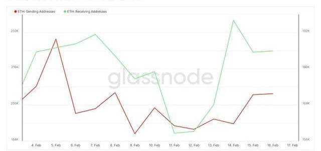ETH發送地址和接收地址之間的比較提供了一些視角。自2月14日以來,發送地址顯著增加。同時,接收地址在同一時間減慢并下降。