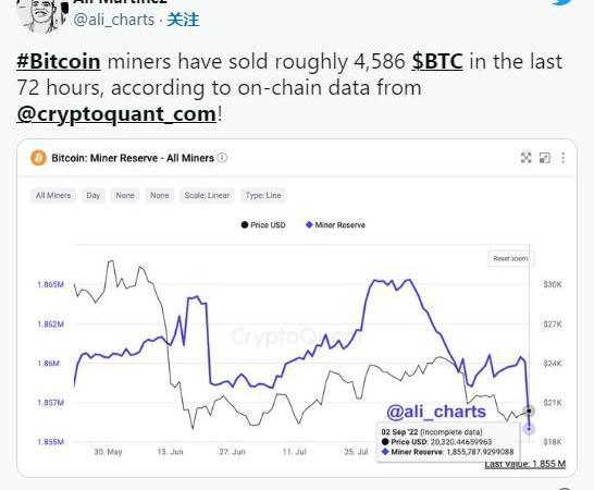 “根據@cryptoquant_com的鏈上數據,比特幣礦工在過去72小時內售出了大約4,586BTC!”馬丁內斯寫道。