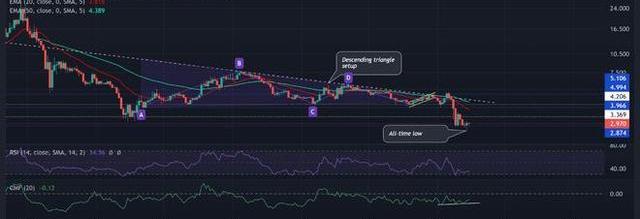 從2.8美元基線的潛在反彈可能會立即卷土重來。在這種情況下,20EMA可能會限制3.9-4.2美元范圍內的看漲復蘇。收盤價低于2.8美元可能會使替代價格進一步下跌。在這種情況下,山寨幣可能會進入價格發現階段。