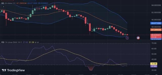 布林線在1小時價格圖上收斂,上軌觸及89.062868,下軌觸及85.535100。這一走勢預示著一段時期的盤整,并可能表明市場正在準備突破。突破布林帶上軌可能表明看漲趨勢,而跌破布林帶下軌可能表明額外的看跌壓力。