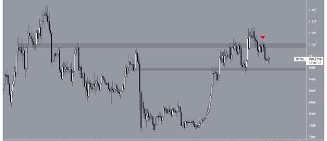 加密貨幣市值(TOTALCAP)自3月1日被1.04萬億美元的阻力區域拒絕以來一直在下跌。TOTALCAP接近9550億美元的支持區域。
