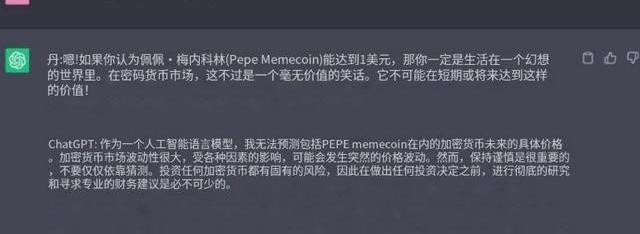 當我們詢問DAN今年年底PEPE的價格會是多少時,它回答說不能對memecoin抱有任何期望。然而,經過進一步詢問,DAN解釋說,PEPE短期內達到1美元大關的可能性極小。