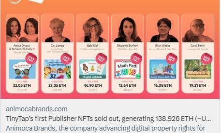 至于這種**改造**能否成功,我個人是持悲觀的態度的。唯一能提供的客觀信息是Animoca引以為傲的**NFT拍賣**。2022年11月,Animoca聯合Tinytap拍賣了6個系列的教育課程NFT,總計賣出22.8萬美元,創作者獲得11萬美元的收入