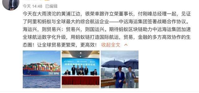 7月6日,螞蟻集團董事長井賢棟今日在微博發文表示,今日,阿里巴巴集團、螞蟻集團與全球最大的綜合航運企業——中遠海運集團簽署戰略合作協議。井賢棟表示,“期待螞蟻區塊鏈助力中遠海運集團加速全球航運數字化升級,用螞蟻鏈打造國際航運,貿易,金融的多方高效協作的生態圈,讓全球貿易更繁榮,更高效。”