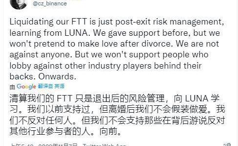 在另一條推文中,Binance首席執行官表示,在Terra倒閉的教訓中,FTT的清算是“退出后的風險管理”。他還表示,交易所不會支持那些游說反對該行業其他參與者的人。