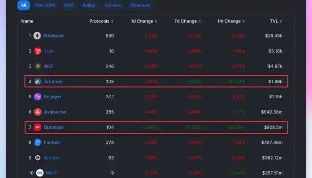 2.查看7日和1個月指標——你會發現只有Arbitrum和Optimism在增長。這對任何人來說都不足為奇,因為我們正處于ETHLayer2season。