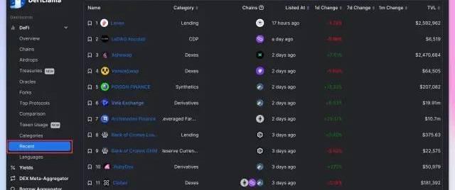 DefiLlama有一個Recent選項,這個功能對于尋找新項目以及查看哪些項目正在鏈上構建非常有用。通常會搜索TVL>200萬美元的協議,看看這些協議有什么獨特的賣點。