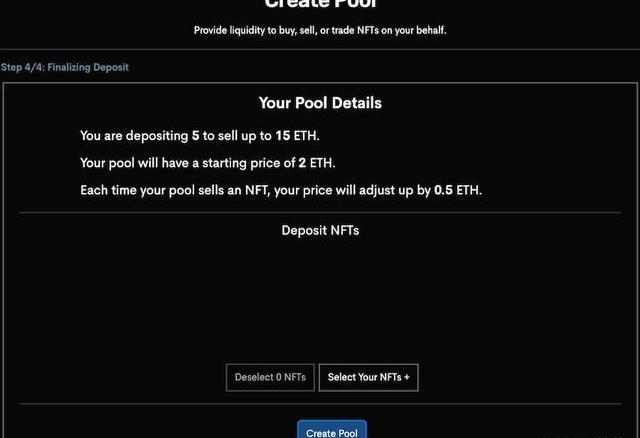 這里著重介紹下sudoAMM的價格設置,用戶可以選擇線性曲線或指數曲線中的一種,然后設置Delta值,Delta值也可以為0。在池創建結束后,用戶也可以選擇繼續存入NFT或者更改價格數據。