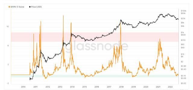 長期趨勢指標MVRV-ZScore以市場總成本作為依據,反映市場總體盈利狀態。當指標大于6時,是頂部區間;當指標小于2時,是底部區間。當前指標為-0.12,回到綠色抄底區間。