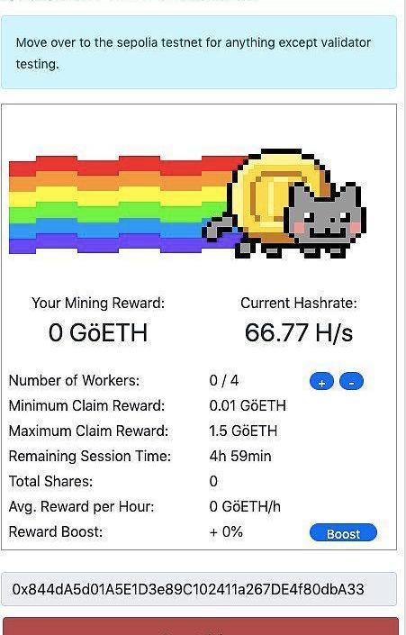 2.https://goerli-faucet.pk910.de/——這個PoW水龍頭可以提供更多的ETH,但是需要你保持頁面打開,踏實挖礦挖出ETH。金色財經記者測試,按照當前算力,大概一小時可以挖出0.02個ETH。
