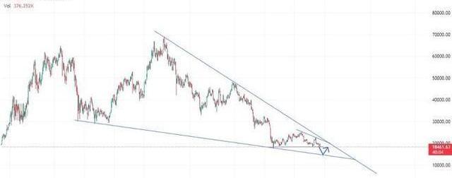 后續走勢非常清晰,只以反彈空為主,價格最終還是會去到我們一直提到的16000-15500,這個點位是下降楔形的下軌支撐處,也是周線下軌,預計會有一波不錯反彈。但由于目前處于相對低位,每次試探新低都會出現不同程度反彈,因為在2萬以下大餅還是非常具有誘惑力定投的與抄底的前赴后繼,所以越到低位下跌越不會順暢,會以震蕩下跌的節奏運行。整體結構上表現為下跌趨勢中的下降三角形,跌破三角形下軌,開啟新一輪下跌。