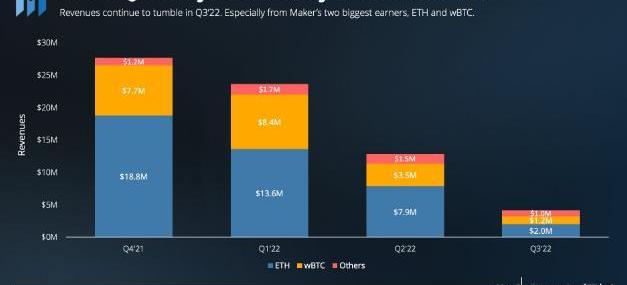 Maker協議的管理機構MakerDAO的收入在2022年第三季度暴跌,原因是貸款需求下降和清算很少,而費用仍然居高不下。