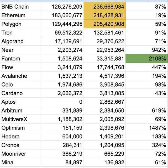 就列表中的唯一地址總數而言,BNBChain緊隨Ethereum和PolygomBlockchain之后,其次是TRON,Algorand,Near,Fantom,Flow,Avalanche(AVAX)、Celo(CELO)、Cardano(ADA)、Aptos(APT)、Arbitrum、MultiversX(Elrond)、Optimisim(OP)、Hedera(HBAR)、Cronos(CRO)、Moonriver(MOVR)和Mina(米娜)。