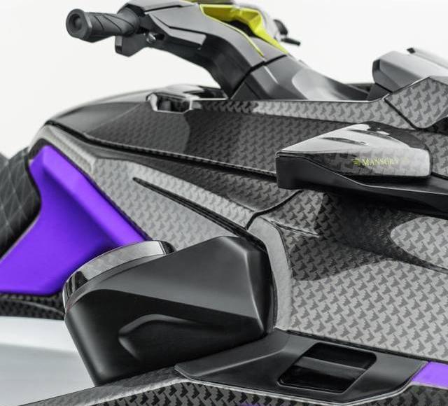 MANSORY邁莎銳JetSki水上摩托艇,采用了鍛造級F117碳纖維打造全套空氣動力學組件,對艇身表面進行了大面積包覆升級,這種極其堅固、超輕的材料,使摩托艇重量減輕了10公斤。