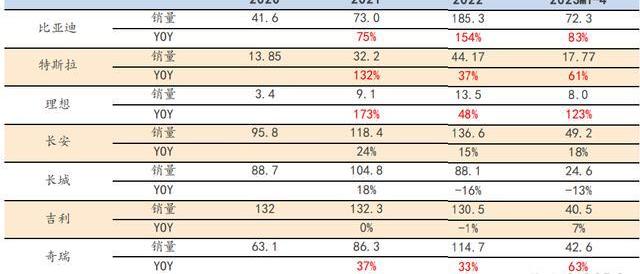 比亞迪、特斯拉、理想、奇瑞等主機廠表現強勢,市場集中度提升。受益于新能源大趨勢以及出口市場的逐步拓展,比亞迪、特斯拉、奇瑞、理想等車企表現強勢,2023年前四個月比亞迪/特斯拉/奇瑞/理想等主機廠銷量表現亮眼,實現銷量72.3/17.8/42.6/8.0萬輛,同比+83%/+61%/+63%/+123%,遠高于行業整體6.9%的增速,乘用車市場集中度提升。