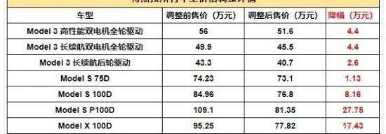 2月22日,特斯拉入門款車型Model3正式登陸中國市場。3月1日,特斯拉宣布,全系車型大幅調價,其中,Model3降價區間為2.6萬元至4.4萬元、ModelS降價區間為1.13萬元至27.75萬元、ModelX降價區間為17.43萬元至34.11萬元。其中,降價幅度達到34.11萬元的是ModelXP100D。這是特斯拉系列產品入華以來降價規模和幅度最大的一次。