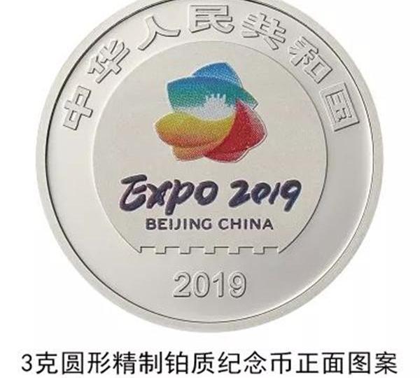 2019年中國北京世界園藝博覽會貴金屬紀念幣,正面圖案均為會徽及長城元素組合設計,并刊國名、年號。其中5克圓形金質紀念幣背面圖案為中國館建筑造型及植物裝飾圖案等組合設計,并刊“2019年中國北京世界園藝博覽會”中文字樣及面額。30克圓形銀質紀念幣背面圖案為國際館建筑局部造型及植物裝飾圖案等組合設計,并刊“2019年中國北京世界園藝博覽會”中文字樣及面額。3克圓形鉑質紀念幣背面圖案為吉祥物及植物裝飾圖案等組合設計,并刊“2019年中國北京世界園藝博覽會”中文字樣及面額。