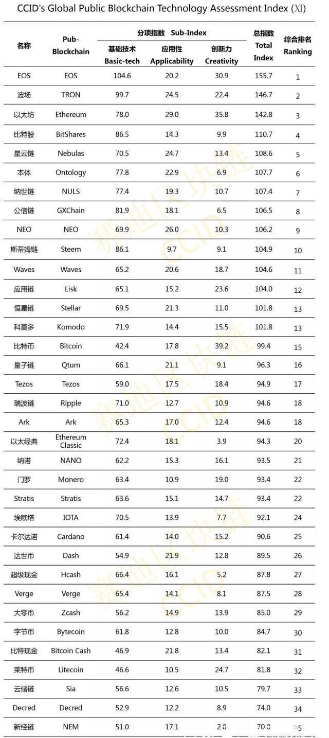 2019年3月22日,賽迪研究院發布了第11期賽迪全球公有鏈技術評估指數,對全球35條公有鏈從技術維度進行綜合考量。結果顯示,全球三大Dapp平臺EOS、波場、以太坊仍然位列榜單前三位,得分分別為155.7、146.7和142.8,與其他鏈得分相比明顯拉開了差距。排名4至10位的分別為比特股、星云鏈、本體、納世鏈、公信鏈、NEO和斯蒂姆鏈。比特幣綜合得分為99.4,在全部35條評估公有鏈中排名第15位,較上期下降2個位次。