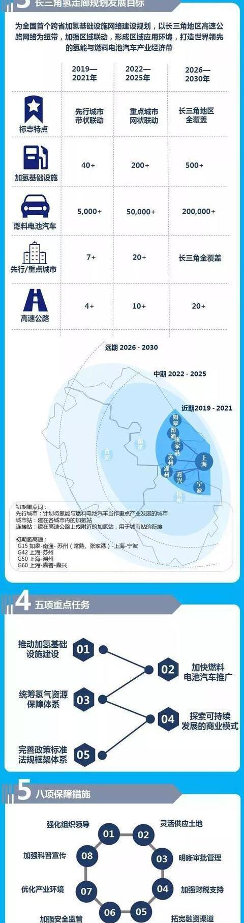 第三階段為遠期發展規劃(2026-2030年),氫走廊要覆蓋長三角全部城市和20條以上主要高速公路,形成具有國際影響力的燃料電池汽車應用區域,充分帶動全國燃料電池汽車產業的發展,推動未來社會清潔能源和動力轉型。
