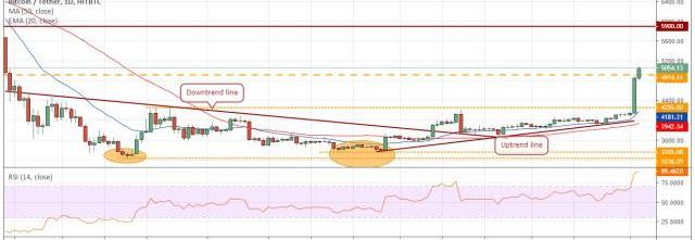 在目前的水平和5,900美元之間,沒有明顯的阻力點。然而,RSI進入了超買區域,這可能導致幾天的盤整或小幅修正。因此,交易者可以在當前水平的大約30%的多頭頭寸中預訂利潤,并再次逢低買入。剩下的頭寸止損可以保持在4,200美元。