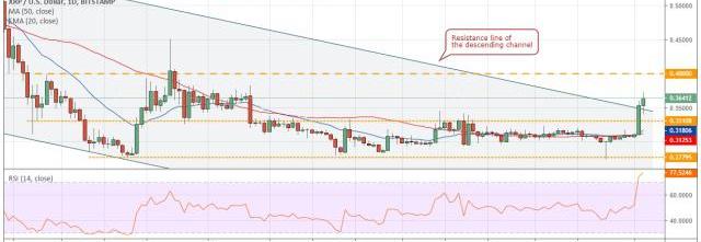 Ripple突破了4月2日0.33108美元的上方阻力位和下行通道的阻力線。如此大幅波動在經過幾天盤整后的窄幅區間是一個看漲信號。它顯示了趨勢的可能變化,首先可以將數字貨幣提升至0.40美元,高于0.45097美元。中期目標是0.60美元。