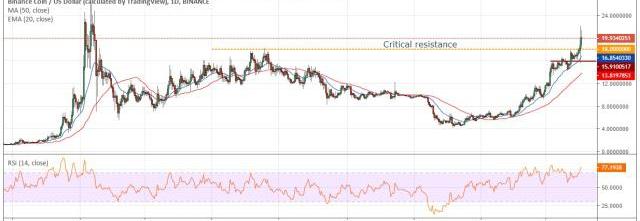 BinanceCoin在4月2日爆發并關閉高于18美元的臨界上方阻力位。這是一個看漲信號,因為它顯示需求甚至更高水平。隨著最新的上漲,加密貨幣已經接近終身高點26.4732350美元。這是一個主要的情緒助推器,因為它證實了在2018年1月的密碼狂熱高峰期間達到的價格可以縮放。