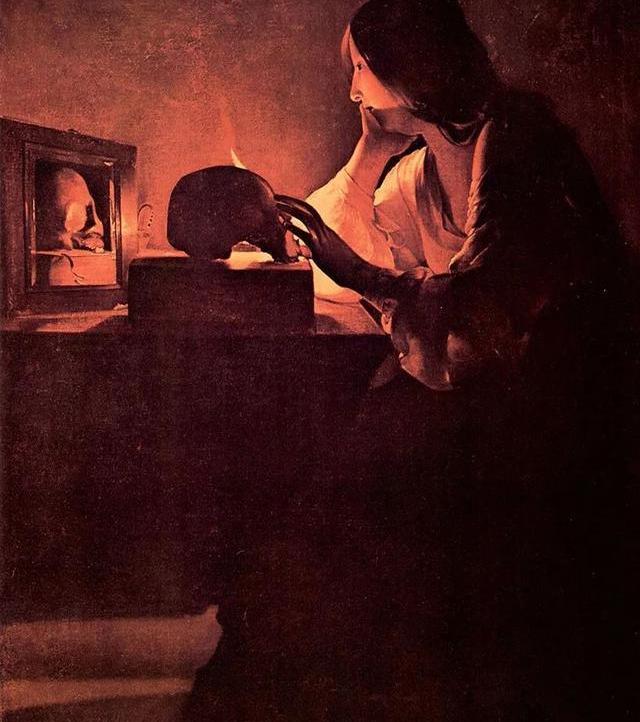 年輕女子對著油燈沉思,畫面靜謐優美,人物形象簡樸精煉,女子腿上的骷髏頭,是拉丁格言Mementomori的象征物,意思是勿忘你終有一死,用以提醒世俗的短暫。
