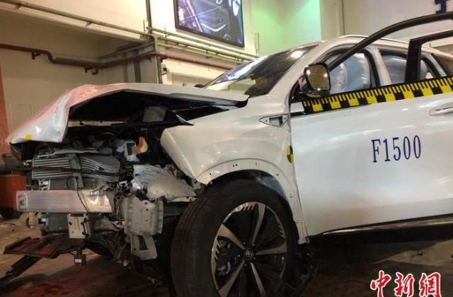 圖為車輛以64千米每小時的速度、40%偏置狀態撞上“障礙物”后。 鐘旖 攝