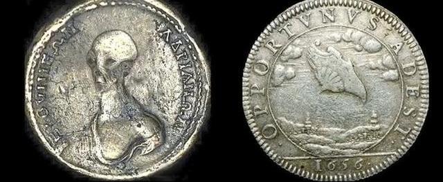 這一枚神秘硬幣的正面印有外星人的圖像及一些被懷疑是希臘文字的字體,而背面則有飛碟出現在天空上的畫面,年份1656和一句拉丁文“OPPORTUNUSAdest”,中文翻譯是“他在適當的時候出現了”,這句話聽上去是一名古埃及人在描寫著當時所發生的情境,而那個“他”到底是外星人還是人類?這詭異的謎團至今仍然無法被解釋。