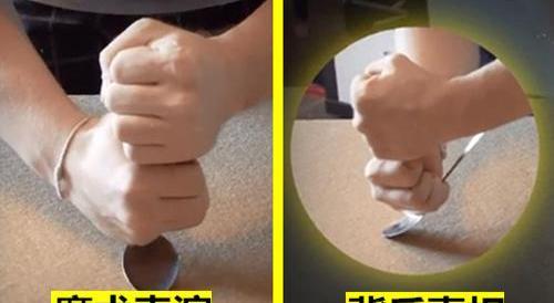 彎曲的湯匙這個魔術表演,應該是經常見到的,就是將一個普通的湯匙在手里變得彎曲,然后又能馬上恢復,對此很多人都會產生疑問這是怎么做到的?其實很簡單,將湯匙豎著放在桌子上,接著佯裝按住湯匙的把手隱藏在你的手中,但實際上雙手并沒有握住把手,而是用手指頭勾住防止湯匙跌落,最后就可以做出將湯匙彎曲的動作。還是很簡單的!