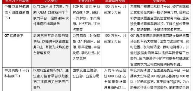 第三方運營平臺可以實現跨品牌的服務,但需要數據支持。對于第三方運營平臺,數據的接入能力是核心。目前看,第三方運營平臺的數據獲取手段包括:1>與OEM合作,通過向OEM廠商提供車聯網技術支持,獲取運營服務的空間,相關案例如中寰衛星;2>與政府平臺合作,通過承建政府監管平臺獲取數據并提供相應的服務;相關案例如中交興路;3>通過向客戶推廣軟硬件一體化解決方案,以后裝設備切入獲取數據,從而為客戶提供管理系統服務,相關案例如如G7。目前,國內第三方運營平臺比較領先的包括G7、中交興路、中寰衛星等。