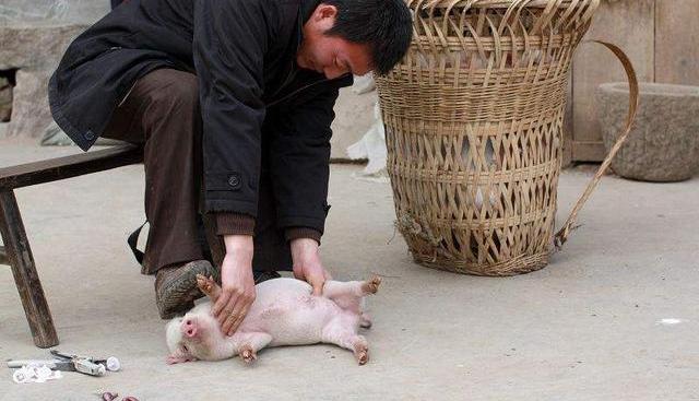操作的流程大約是這樣的:幾個人將小豬摁倒,翻它個肚皮朝天,劁豬的拿被麻紙包著的小刀、鉤子、縫針和線,朝著小豬的睪丸部位用刀割開,然后鉤出小豬的“花花腸子”,割去,縫合,抹點草灰算是消,然后放開豬,這項工作就算是完成了。母豬也劁,因為在發情期,也會不好好吃食,甚至干些毀墻、咬人之類的粗暴事,也不好好長肉,所以得劁。據說,母豬割去的是卵巢,但我沒見過,想必操作的手法也一樣吧。先后大約需要不到十分鐘時間,老匠人甚至用三五分鐘,劁過,豬就可以立起來,渾身抖著走或者跑了。