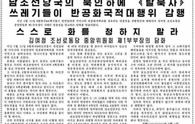 當地時間6月4日,朝鮮最高領導人金正恩的胞妹、勞動黨第一副部長金與正通過《勞動新聞》發表談話,強烈譴責這一事件,稱"脫北者"污蔑朝鮮最高領導人,并拿"核問題"說事,對朝方惡意詆毀。