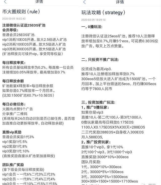 “投資加推廣”玩法是指,VIP會員通過發展下線的方式提高“礦池”的速度釋放,以及獲得直推獎、團隊獎等獎勵。直推獎是指會員每發展一名VIP會員可以獲得3%到10%的返利;團隊獎是指VIP會員可以拿下線會員每天“礦池”釋放的獎勵。