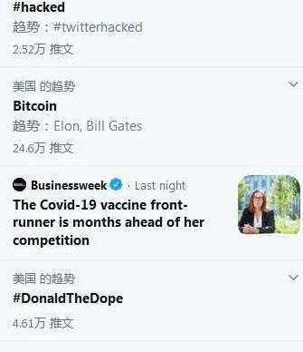 賬號遭黑客入侵的人士包括美國前總統奧巴馬、民主黨總統候選人拜登、微軟公司創始人比爾·蓋茨、亞馬遜公司創始人杰夫·貝佐斯、金融大亨沃倫·巴菲特、特斯拉CEO埃隆·馬斯克、紐約市前市長邁克爾·布隆伯格、歌手坎耶·韋斯特、美國社交名媛金·卡戴珊等。